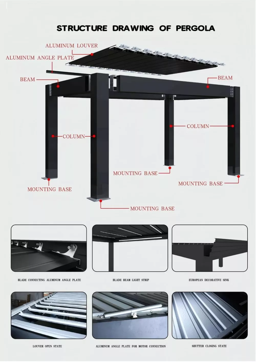 Motorized Louvered Pergola ส่วนใหญ่ประกอบด้วยส่วนต่างๆ ดังต่อไปนี้: