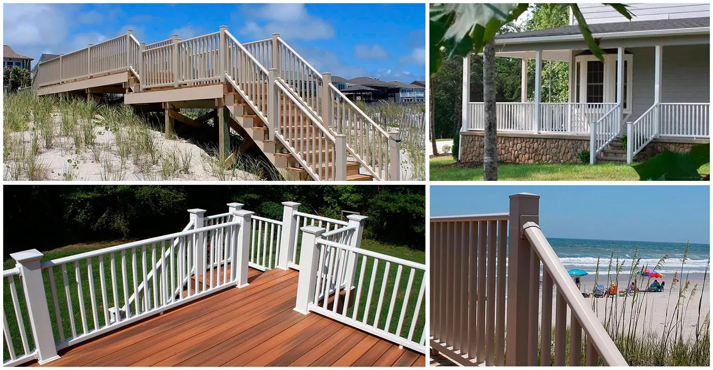 ราวบันไดไวนิลเป็นทางเลือกยอดนิยมที่ไม่ต้องดูแลรักษามากแทนไม้ ทำจากพีวีซีที่ทนทาน ได้รับการออกแบบมาเพื่อต้านทานการเน่าเปื่อย แมลง และความเสียหายจากสภาพอากาศ โดยไม่จำเป็นต้องทาสีหรือย้อมสี ซึ่งใช้กันอย่างแพร่หลายสำหรับดาดฟ้า ระเบียง และพื้นที่กลางแจ้ง
